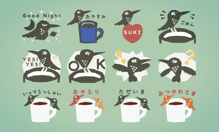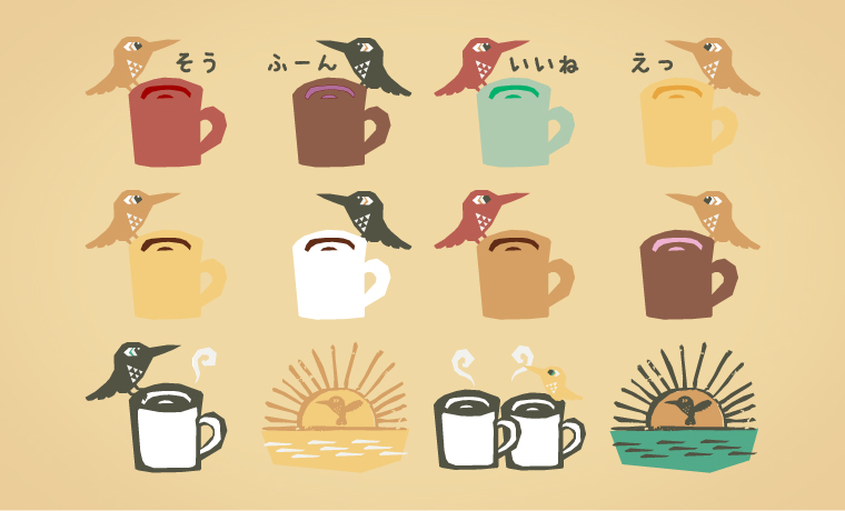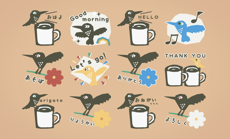 コーヒー移動販売店ハチドリコーヒーの鳥さんをモチーフに日常に使えるスタンプです。